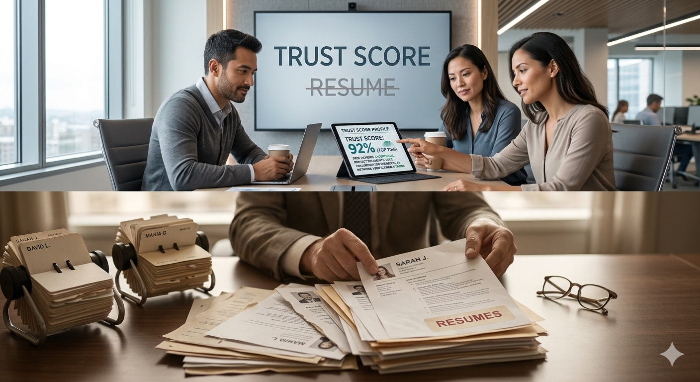 Resumes lie. Trust scores don't. Learn how quantified reliability, consistency, and proven work are replacing traditional credentials in hiring.